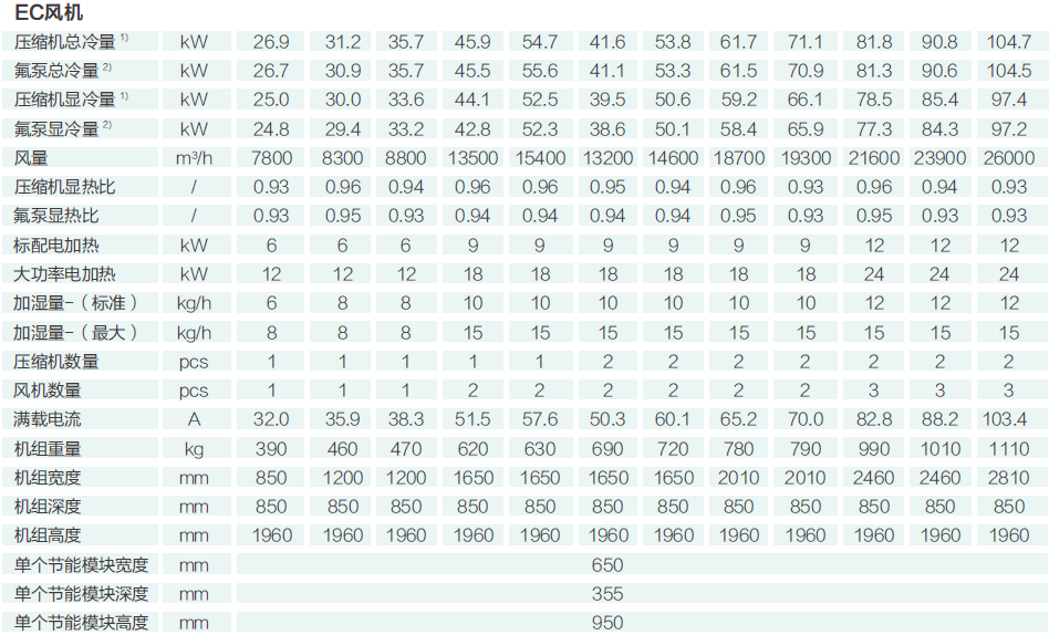 單壓縮機(jī)制冷系統(tǒng)機(jī)型配置一臺(tái)氟泵自然冷節(jié)能模塊,雙壓縮機(jī)制冷系統(tǒng)機(jī)型配置兩臺(tái)氟泵自然冷節(jié)能模塊,確保在室外環(huán)境溫度較低時(shí)能關(guān)閉全部壓縮機(jī),充分利用自然冷源,降低能耗。